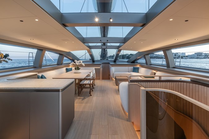 On the main deck, the lounge has comfortable U-shaped seating opposite a formal dining table to port. Blending inside and out, expansive glass doors aft open out to the recessed aft cockpit. Furnished with the best of everything, a warm colour palette perfectly pairs with modern furnishings.